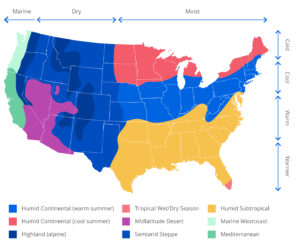 Due to its vast size and diverse geography, the US experiences a wide range of climate zones. Many regions have a continental climate marked by cold winters and hot summers, but exceptions abound: