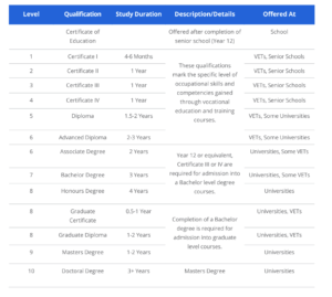 In Australia, there are 10 levels of qualifications you can earn after finishing school. These levels are part of the Australian Qualification Framework (AQF), which sets the national standards for each qualification..